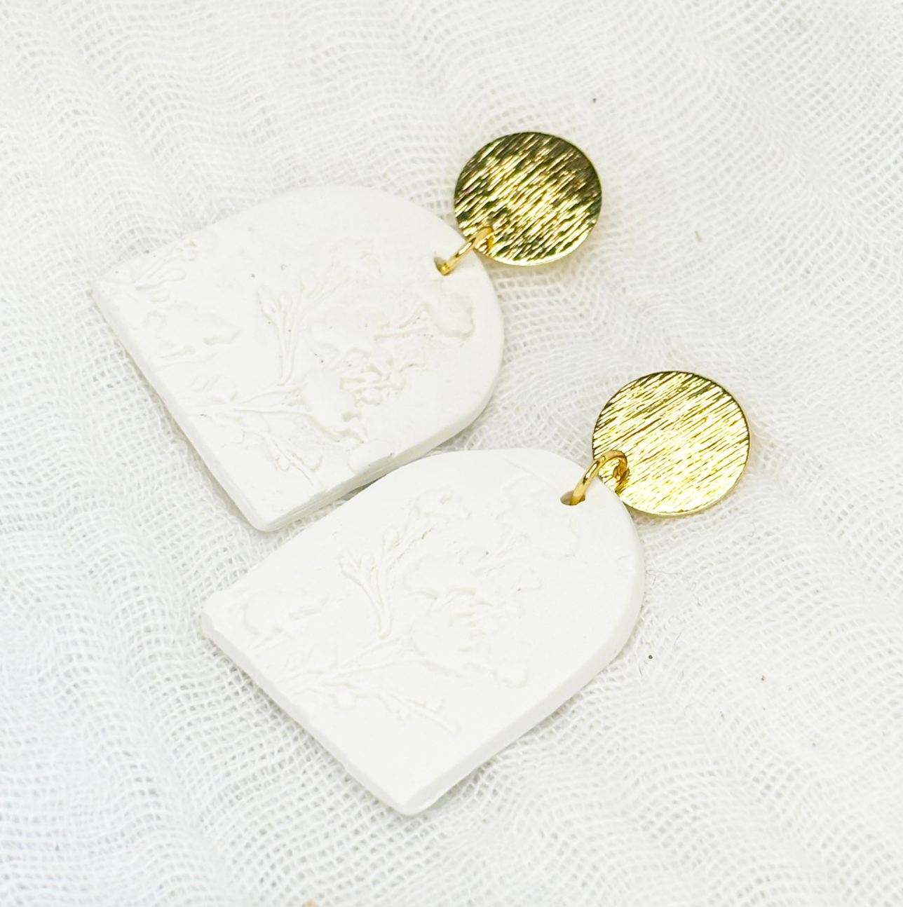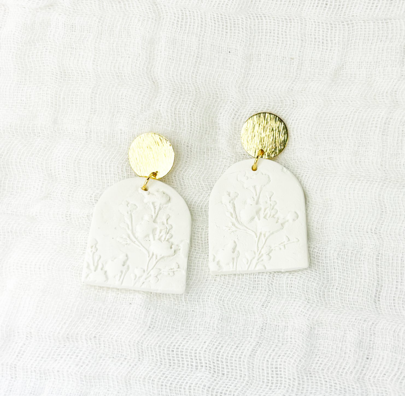 Handmade by survivor-artisans, the Sozo earrings are clay statement earrings made with a floral imprint and gold circular post.