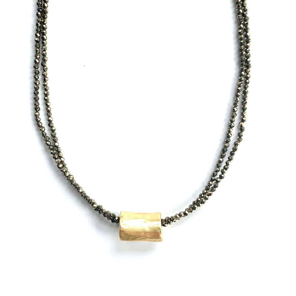 Our barrel collection continues to grow with our brushed gold and hammered barrel pendant on double strands of pyrite.  16-18 inch adjustable.