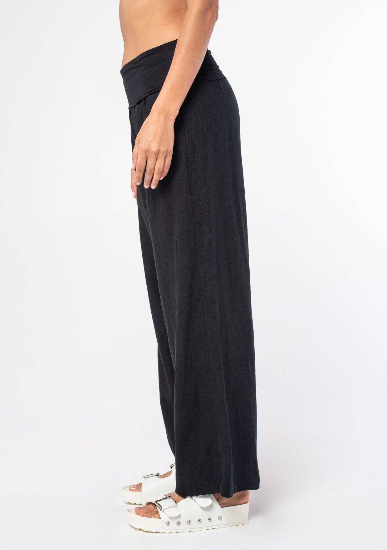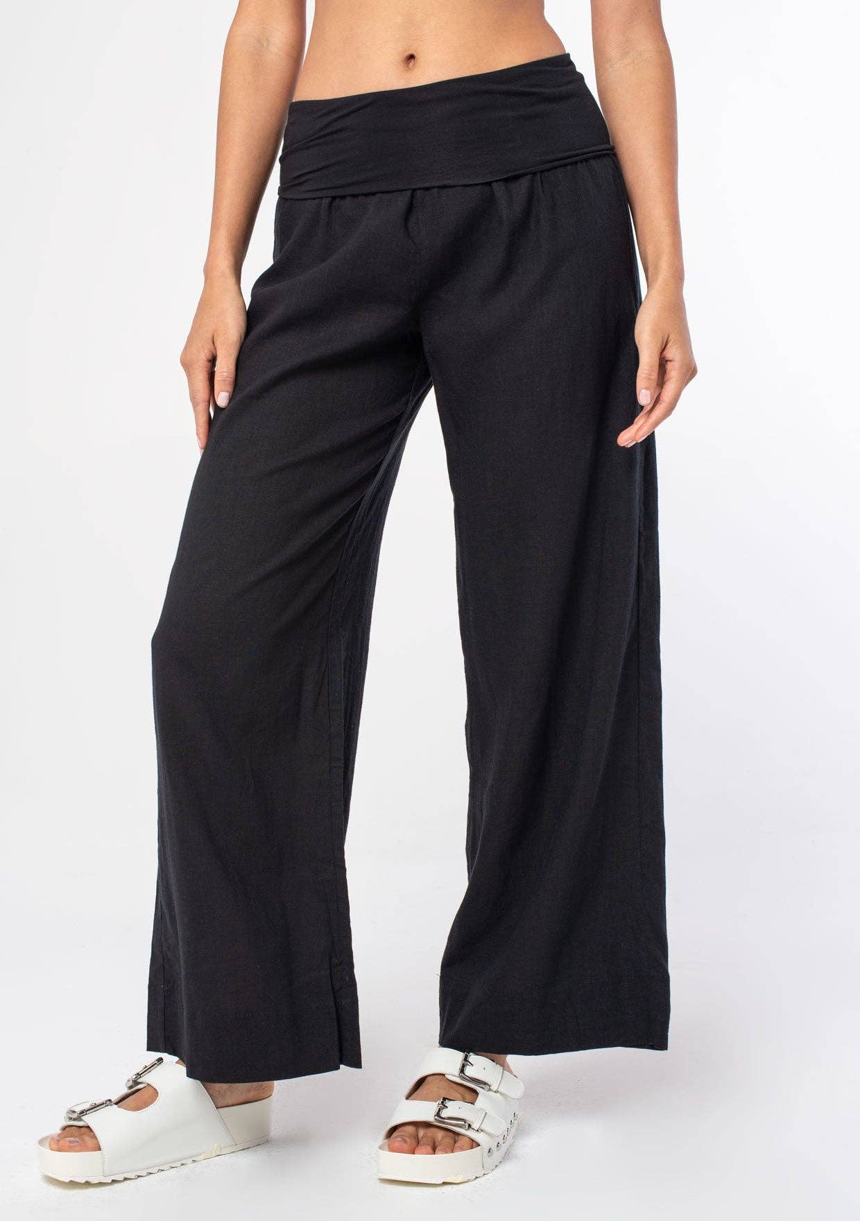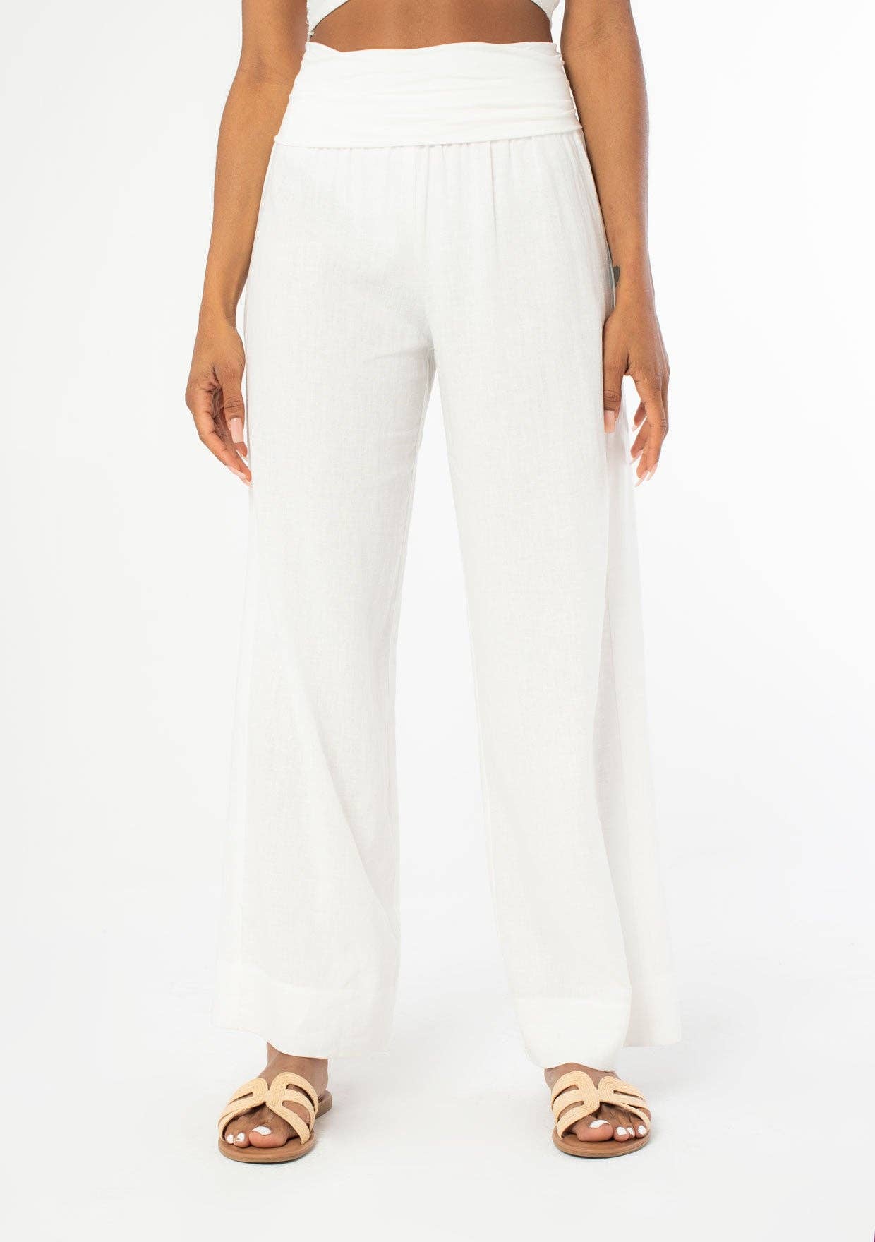 Chic and cool bohemian lightweight pants featuring a trendy wide leg and a contrast foldover waistband. Perfect addition to any Summer collection.