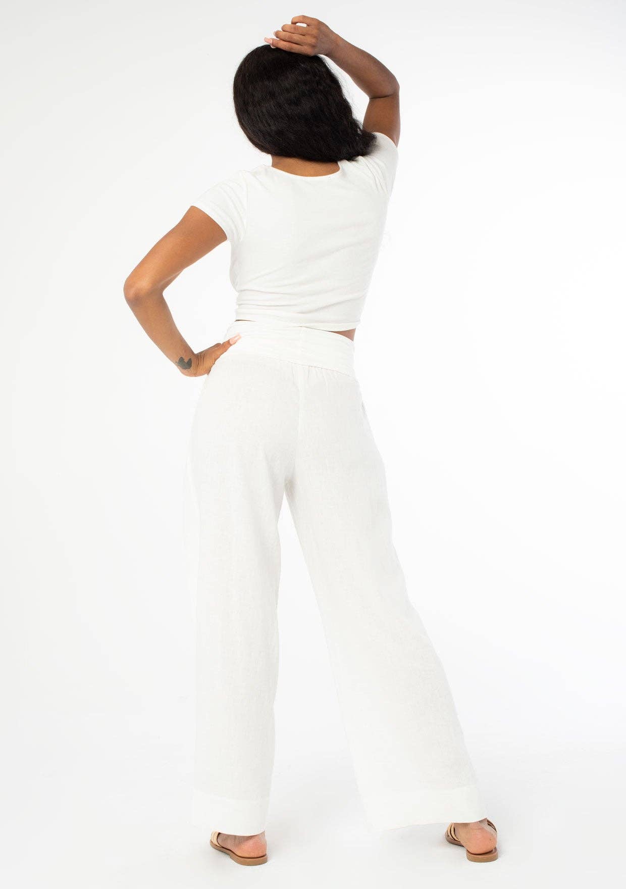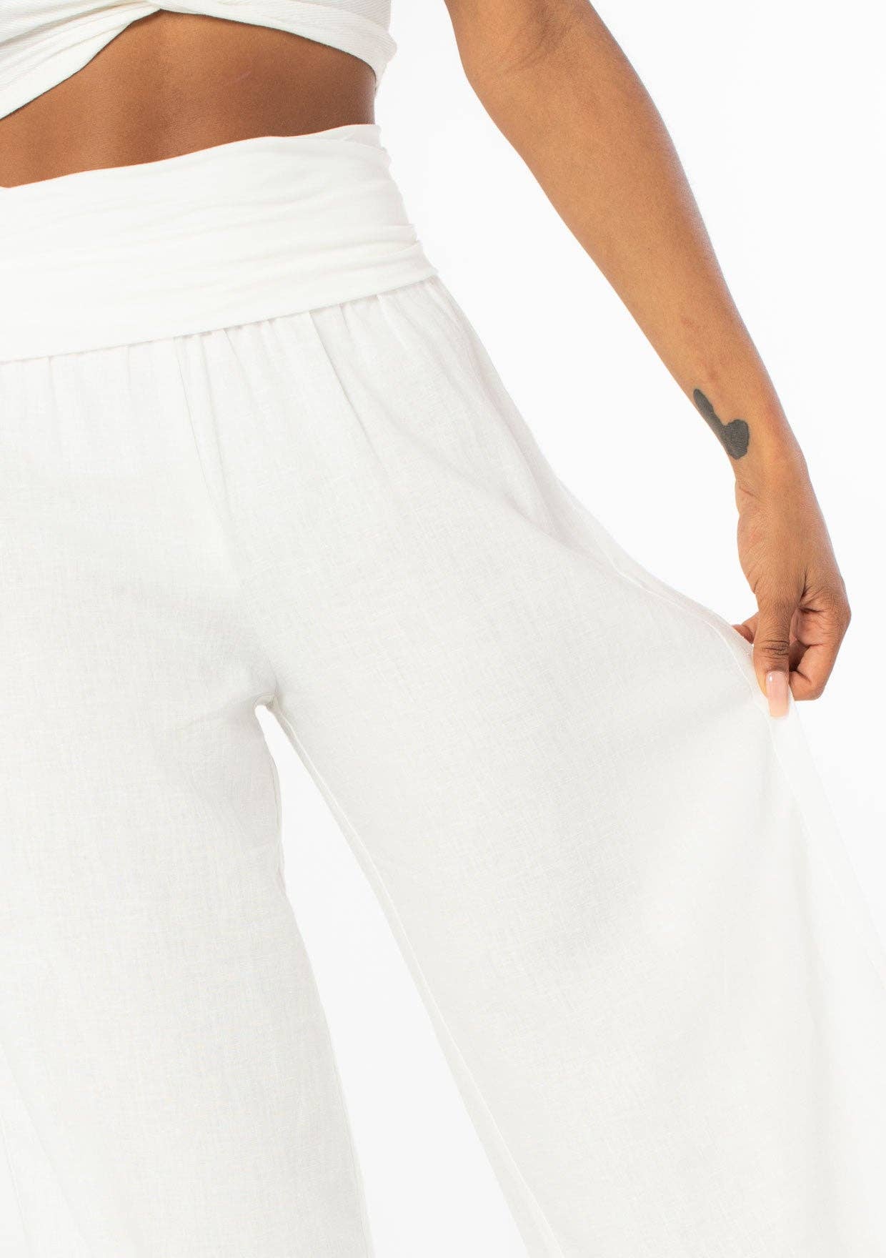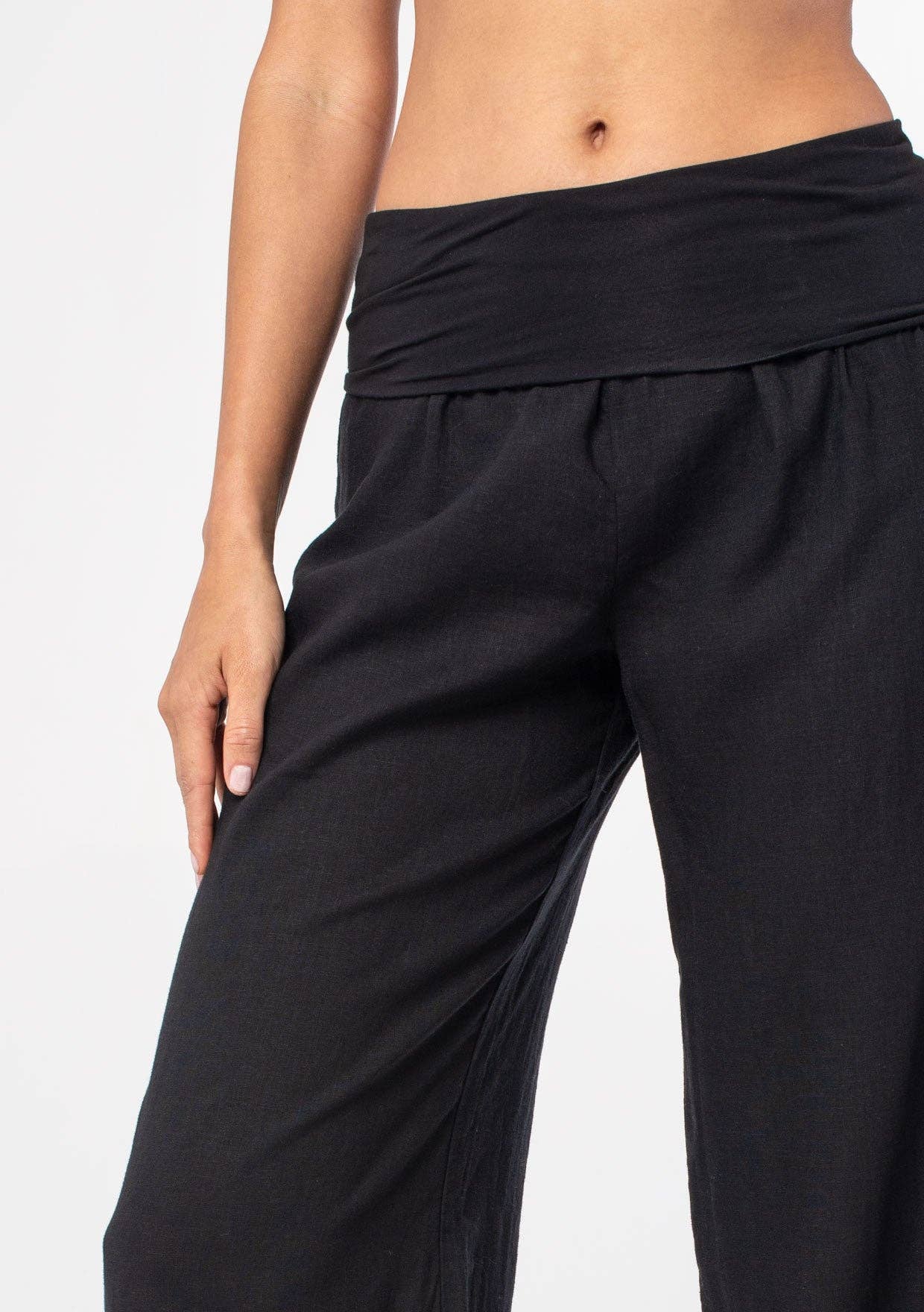 Chic and cool bohemian lightweight pants featuring a trendy wide leg and a contrast foldover waistband. Perfect addition to any Summer collection.