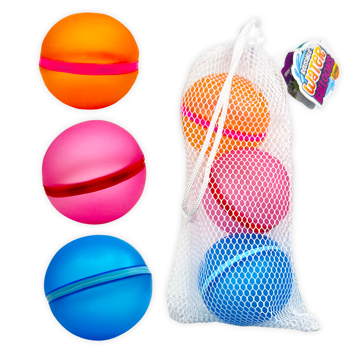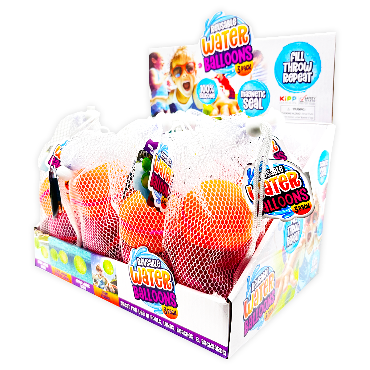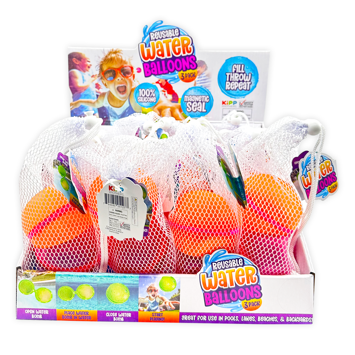 Get ready for endless hours of summer fun with our 3-Pack Magnetic Water Balloons! Made of 100% silicone, these reusable water balloons are perfect for pools, lakes, beaches, and backyards. With a magnetic seal, simply fill, throw, and repeat for non-stop entertainment! Toy bin card included for use on the So Much FUN! Toy Bin Program corrugated display or in the clear toy bin pockets.