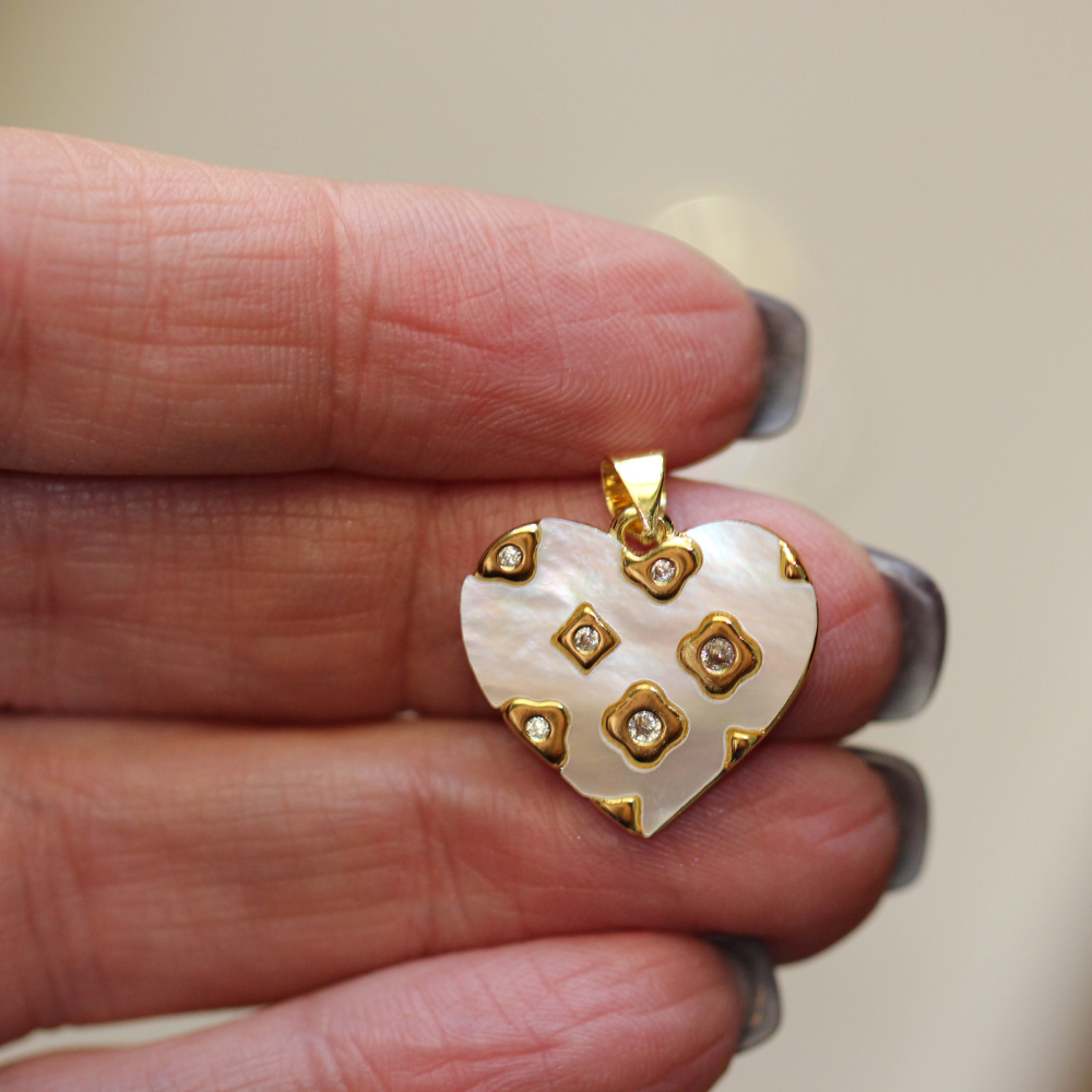 The "Pearl Blossom Heart Charm" combines timeless elegance with unique artistry. Featuring a lustrous mother-of-pearl heart adorned with intricate golden floral accents and shimmering CZ stones, this charm radiates sophistication and grace. The luxurious gold-plated finish enhances its refined beauty, making it a stunning addition to necklaces, bracelets, or earrings. Perfect for Deep South Originals charm bars, this charm is a beautiful symbol of love and nature.