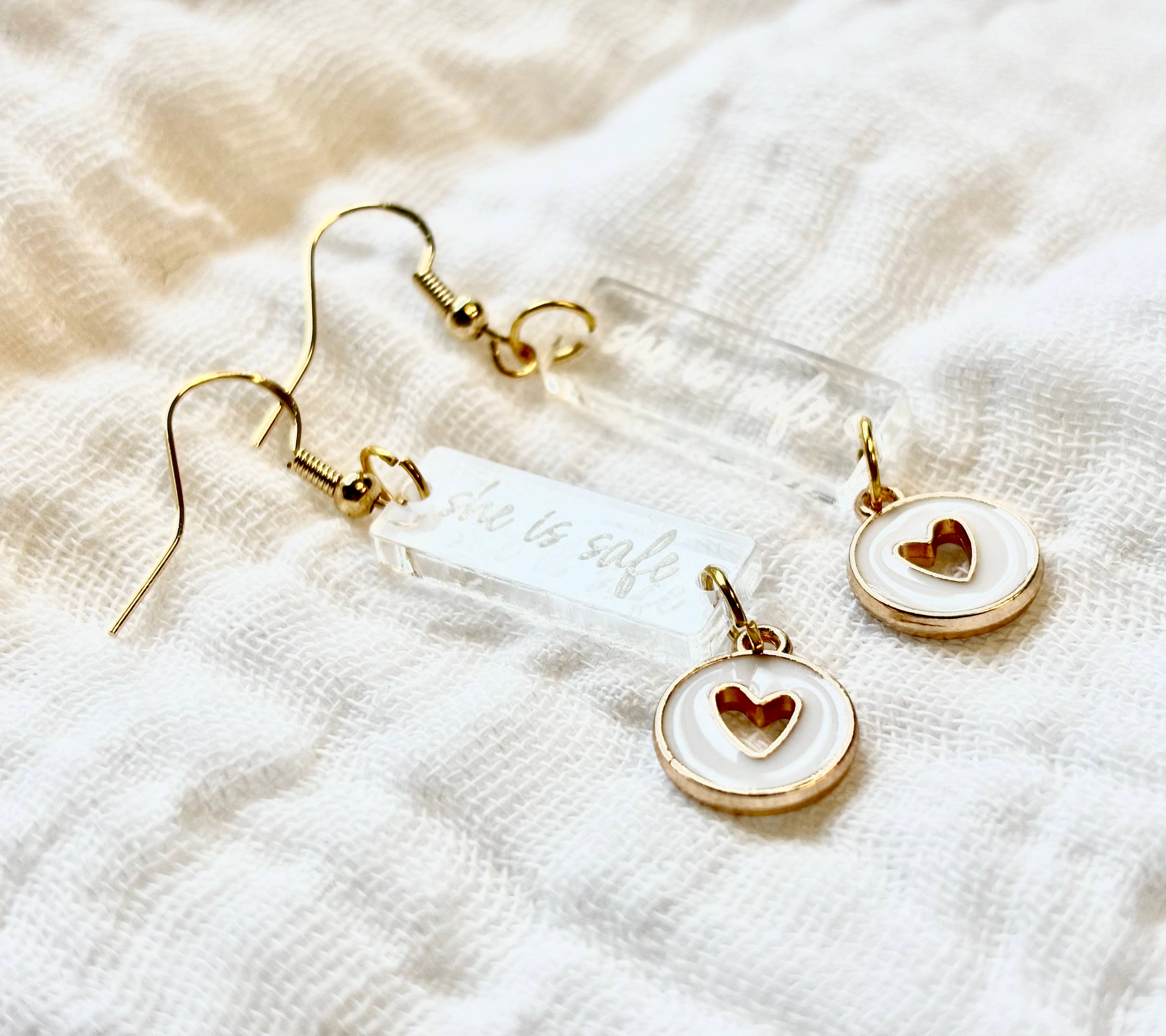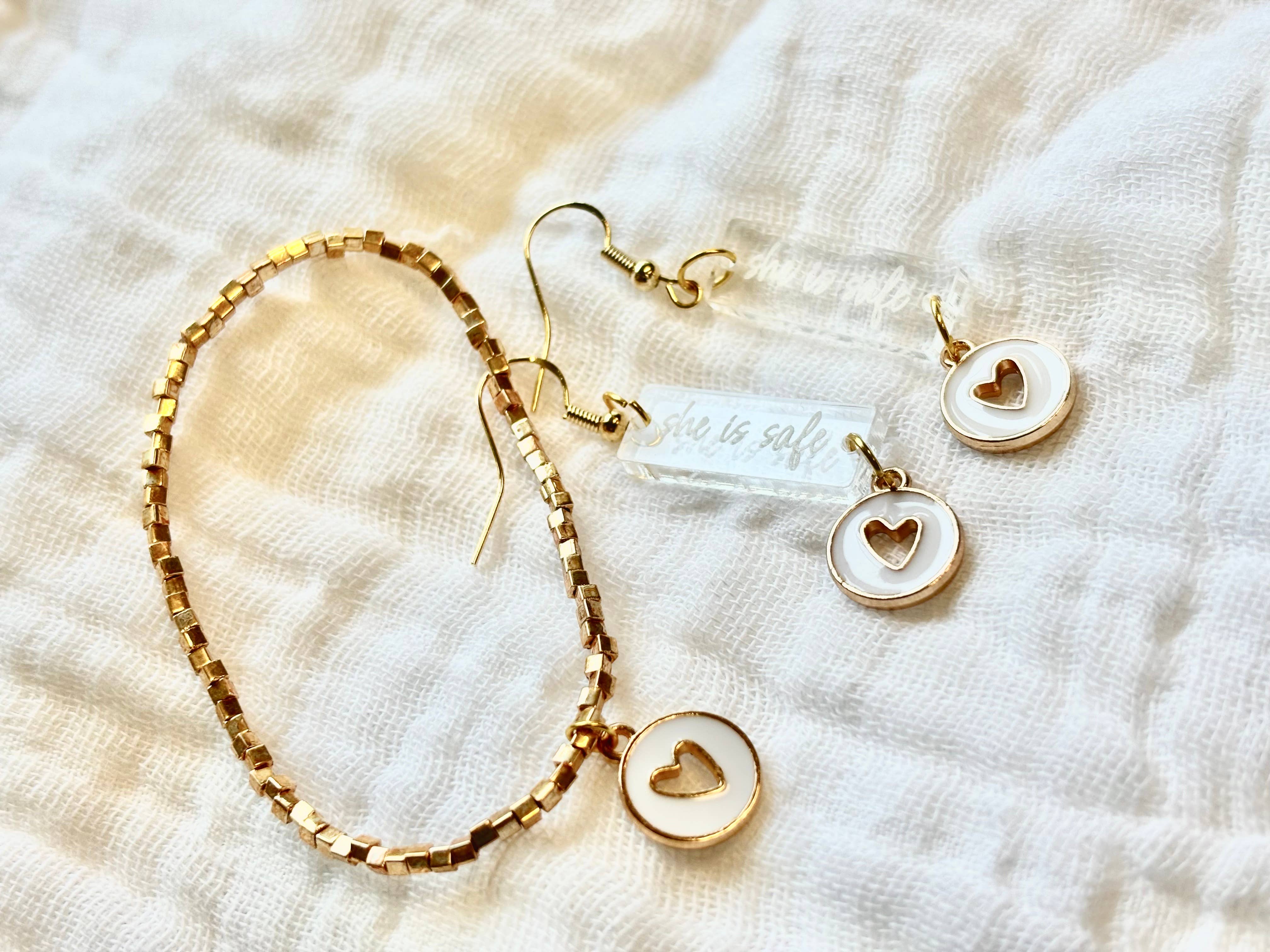 This beautiful bracelet & earring set features a golden, square seed bead bracelet with a white and golden heart charm as well as acrylic etched "She Is Safe" earrings with a matching heart charm. Perfect addition to any outfit, this beautiful bracelet & earring set is dainty and classic.
